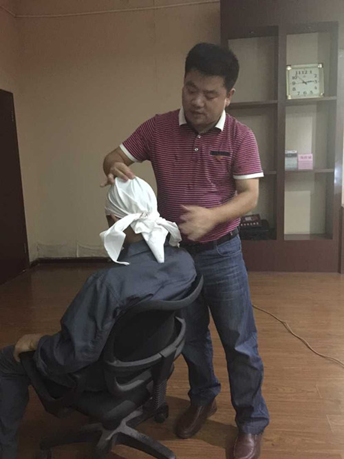 亓主任做头部创伤包扎示范